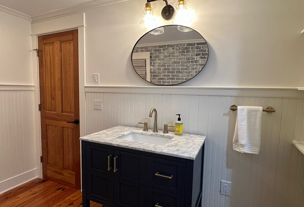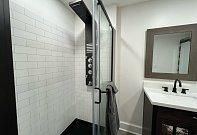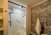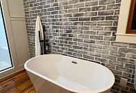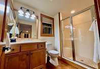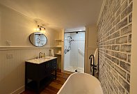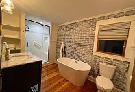 As you continue thru the Living Room just past the office space on the left is a spacious main bathroom with a free-standing soaker tub and separate shower, along with new vanity.