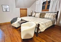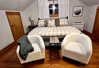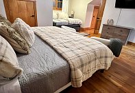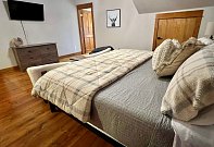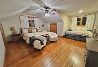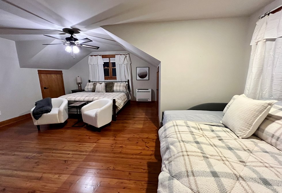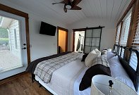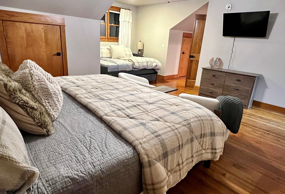 Upstairs you will find a spacious, large wide open bedroom suite with King sized bed and full size day bed along with television, sitting area and it’s own full bathroom.