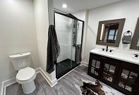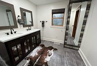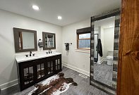 Just past the dining room is a large main floor king suite with ensuite bathroom, tv, separate sitting area and door to the back leading to the back deck. The en-suite bathroom has a double vanity and massaging shower system.