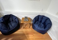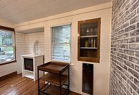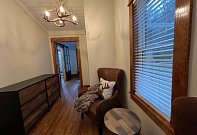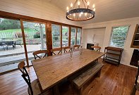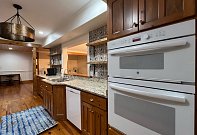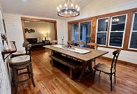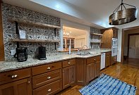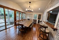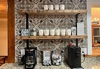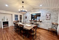 The center of the house is the well equipped kitchen and dining room. The dining space is spacious and inviting, with bar, electric fireplace, & wine fridge. Kitchen has additional amenities like a stocked coffee/tea bar with a kuerig, Nepresso & drip coffee maker and is stocked with coffee & tea supplies to enjoy during your stay, including coffee, pods, tea, sugar & assorted creamer.