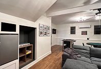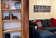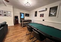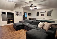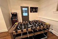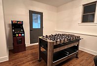 As you make your way thru the kitchen you will find the game room and family room space with large screen tv, fireplace, poker table, Pac-Man freestanding Arcade game and convertible game table with ping pong, pool and foosball. Along with all the game room fun is the kids camp bedroom with tent bunk bed.