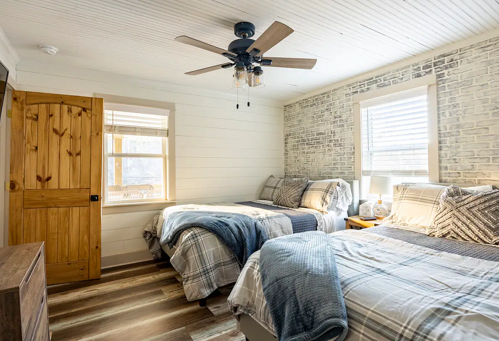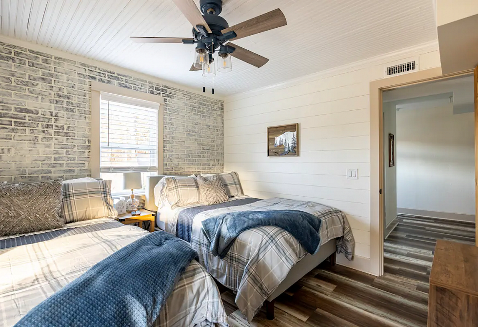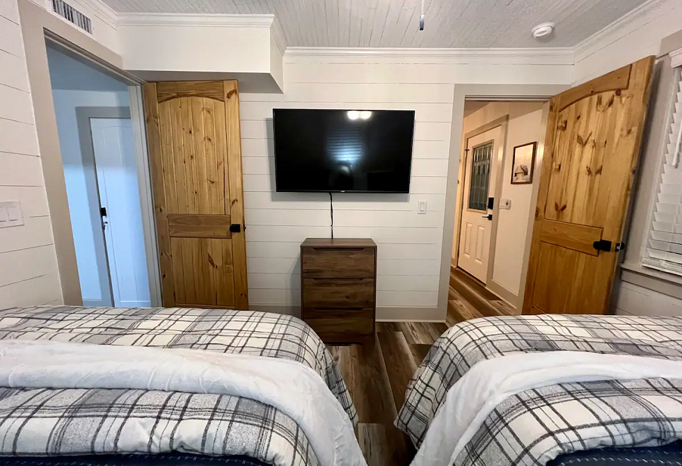 This first floor bedroom is located off the living room with two plush full size beds, large screen TV and is conveniently right next to the newly remodeled downstairs full bathroom.